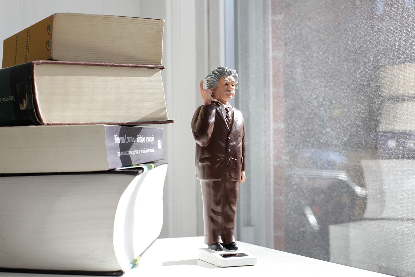 ソーラーパネルに太陽光があたると、何か考える仕草をするアインシュタインのオブジェ。見てるだけでいいひらめきがもらえそう。