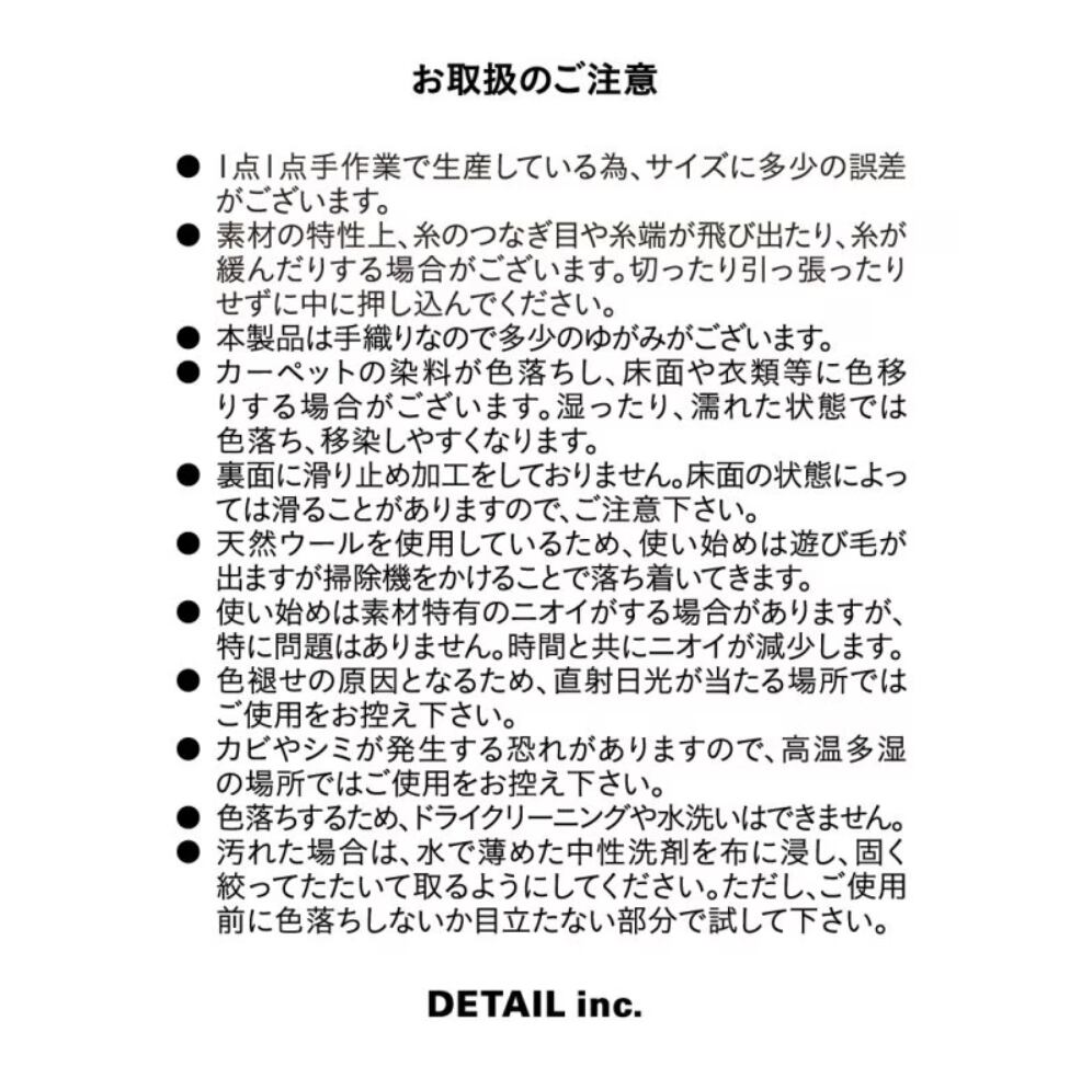 様々なデザインがあるタイガーラグの中から、アイコニックなタイプを元にインドにて手作業で作られています。厚み1.8cmとしっかりした作りで、へたりにくく、保温性、調湿性に優れ、汚れがつきにくいラグに適した素材のウールを使用。