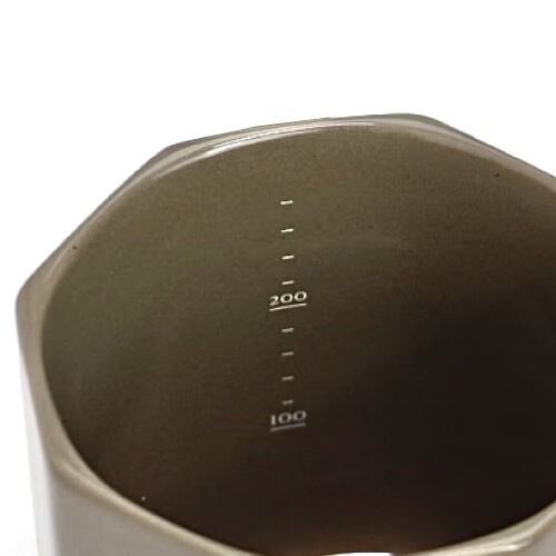 本体の内側に100mlから20ml単位で計量用の目盛がプリントされている磁器製マグカップ。